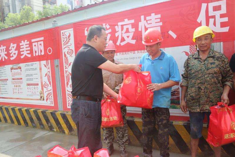 入夏以來,南昌旅游集團(tuán)積極開展“戰(zhàn)疫情、促文明、保安康”送清涼活動(dòng),7月28日上午,南旅集團(tuán)黨委書記、董事長、總經(jīng)理李明,黨委副書記李虹虹,黨委委員、副總經(jīng)理陳皓等領(lǐng)導(dǎo),冒著高溫,來到我市重點(diǎn)工程“繩金塔民俗風(fēng)情街”項(xiàng)目,送上綠豆、蓮子等愛心禮包,向戰(zhàn)斗在一線建設(shè)的干部職工表示慰問。李明在聽完工程建設(shè)情況匯報(bào)后,仔細(xì)詢問了現(xiàn)場工人工作、生活狀況,叮囑項(xiàng)目部要一手抓好工程建設(shè),一手抓好防疫防暑,切實(shí)關(guān)心工人身心健康,確保職工安全生產(chǎn),文明施工,為我市創(chuàng)建健康、文明城市作貢獻(xiàn)。公司黨委書記、總經(jīng)理龔戩等班子成員全程陪同。