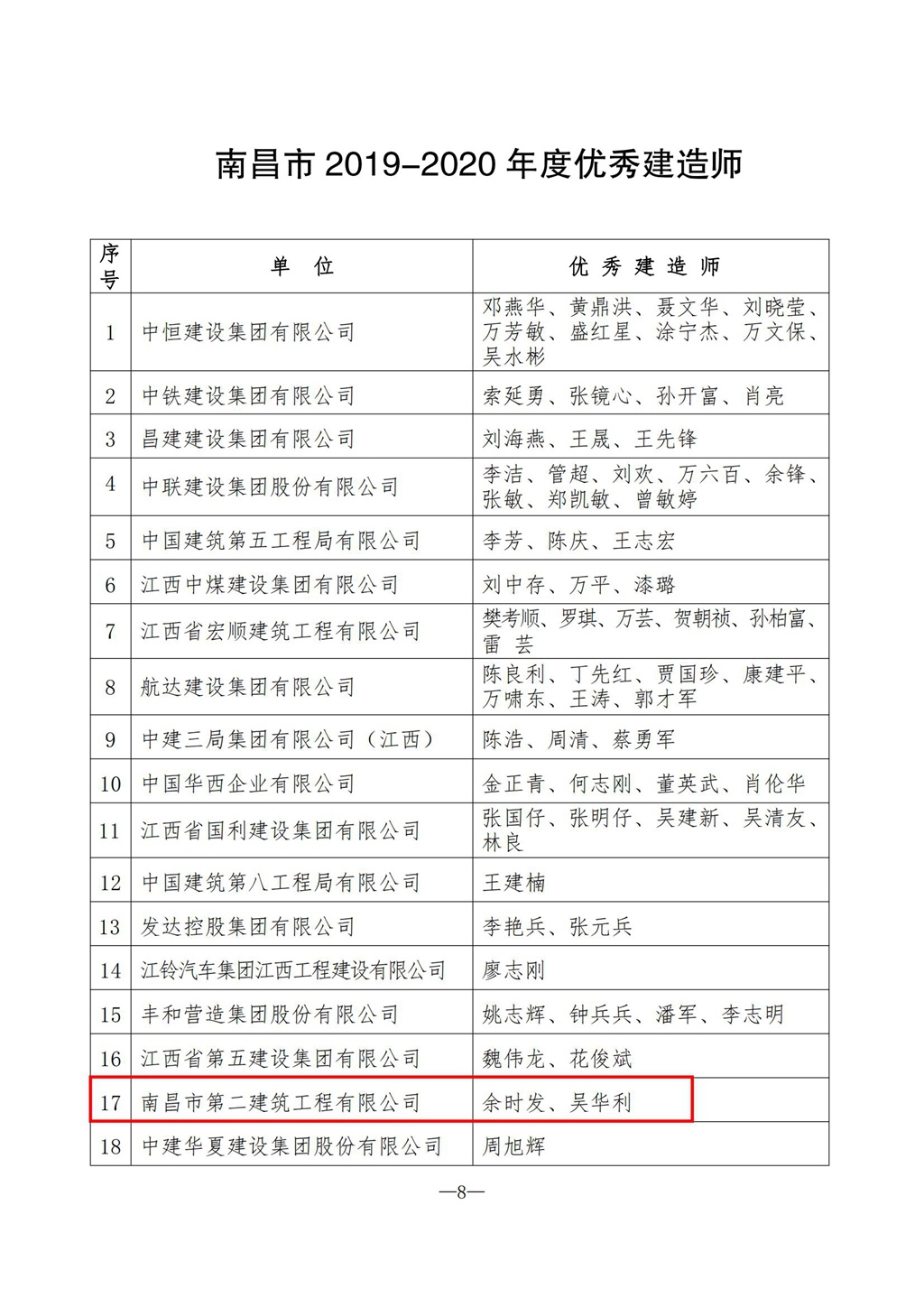 為表彰先進、樹立典型,鼓勵建筑業(yè)做大做強,著力推動我市建筑業(yè)快速健康發(fā)展,南昌市建筑業(yè)協(xié)會開展全市 2019—2020 年度南昌市建筑業(yè)先進企業(yè)和優(yōu)秀建造師(監(jiān)理師)評選活動。經(jīng)企業(yè)申報、市建協(xié)評審、綜合市建設局相關(guān)職能部門意見,共有 82 個單位被評為南昌市建筑業(yè)先進企業(yè) ,151 名建造師被評為南昌市建筑業(yè)優(yōu)秀建造師,其中,我公司再次獲評市“先進企業(yè)”、余時發(fā)和吳華利被評為市“優(yōu)秀建造師”稱號,并受到表彰。